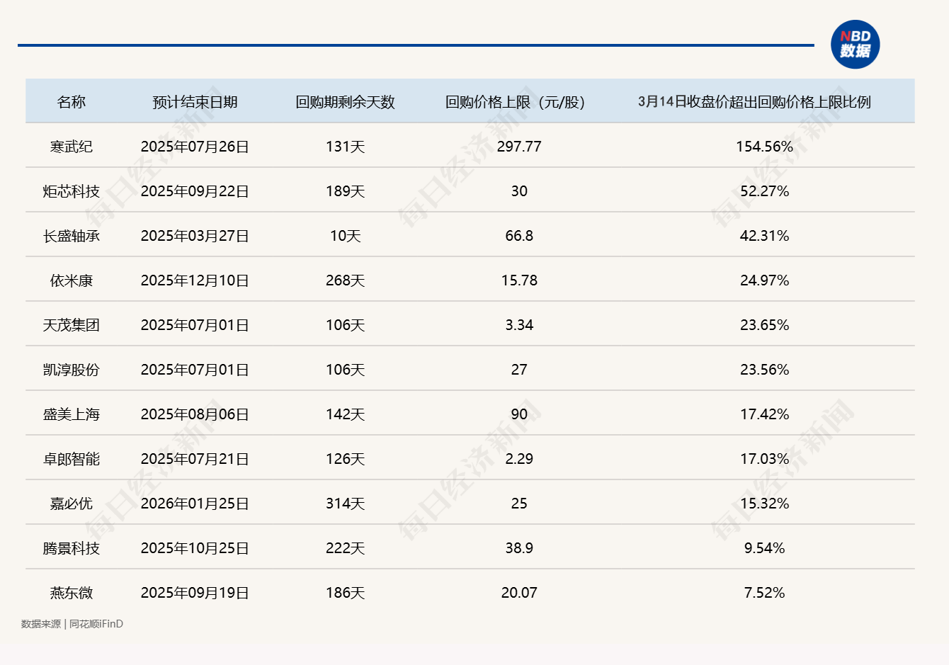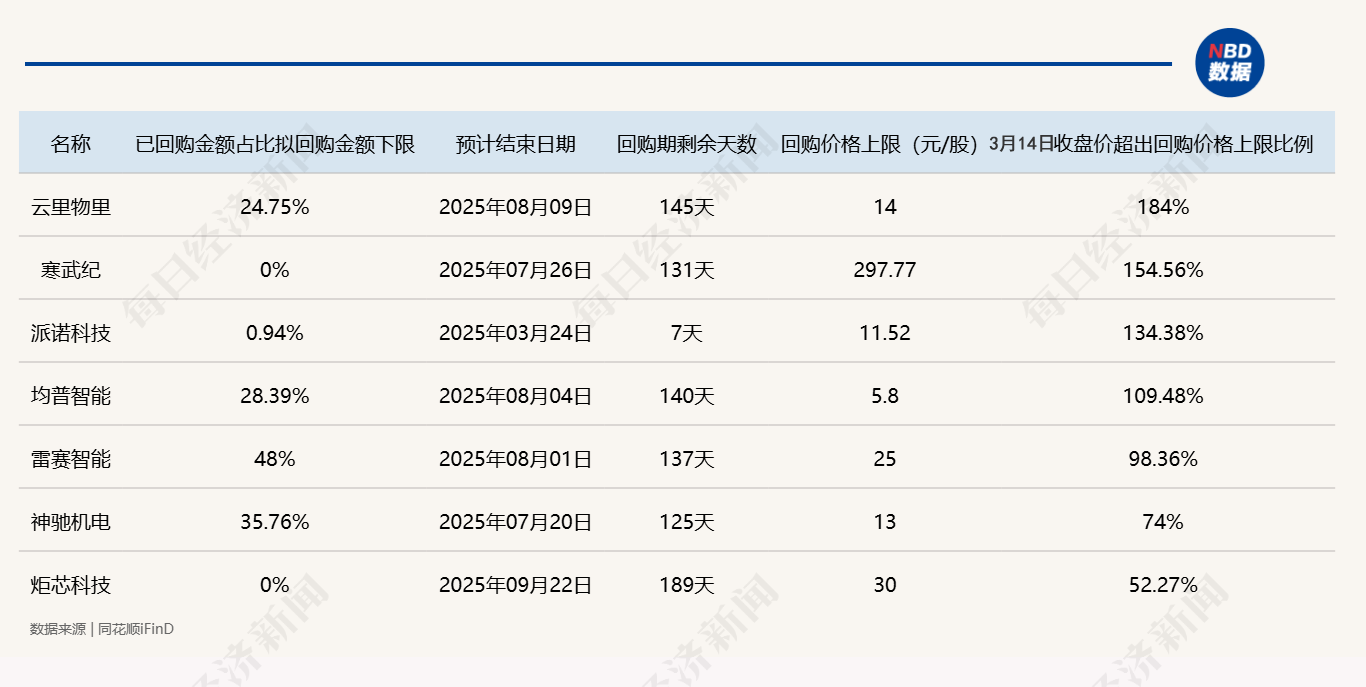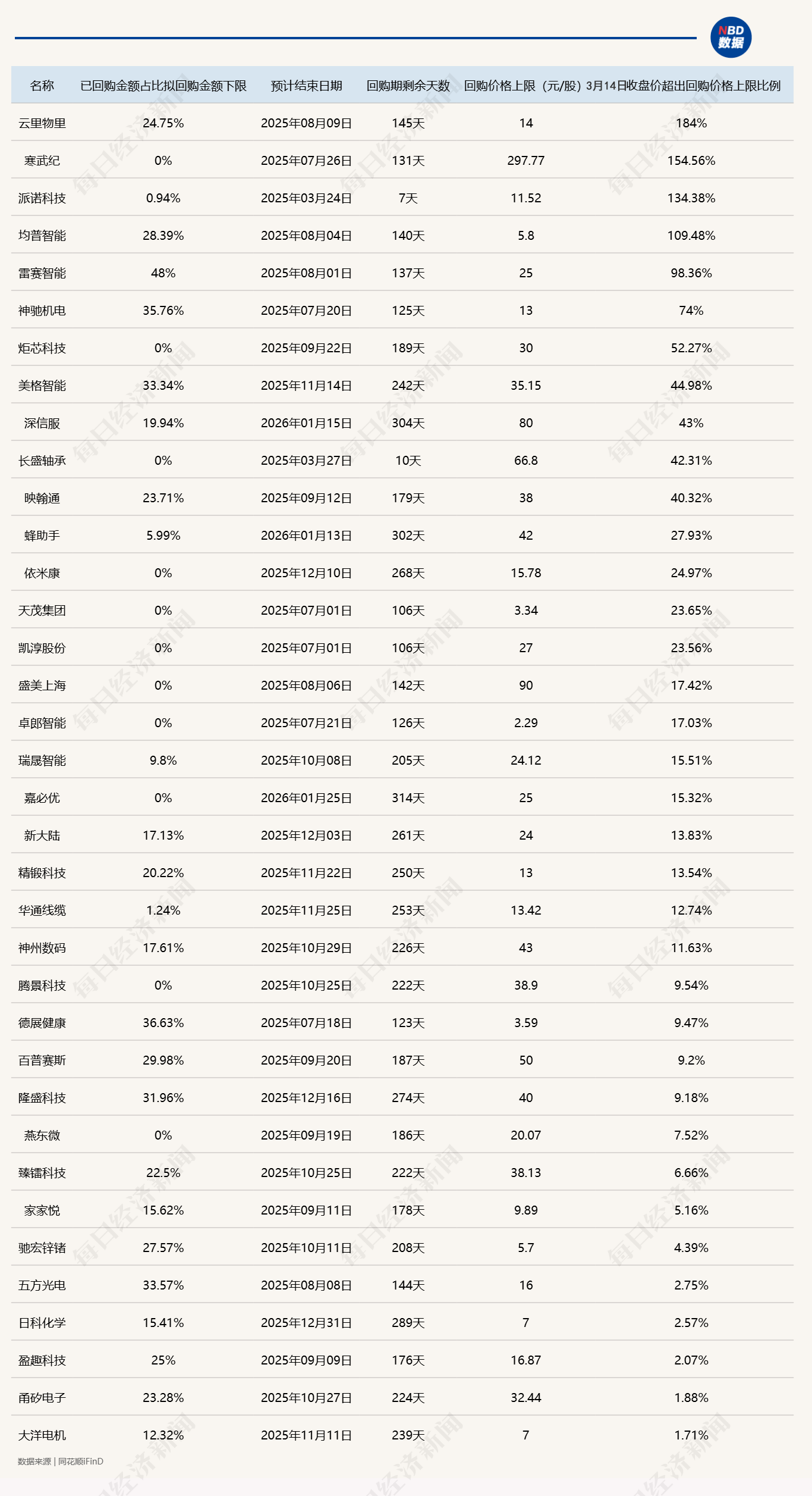 那么,A股目前正在实施回购的公司实际进展情况如何呢?据同花顺数据统计,截至2025年3月14日,约有454家公司正在实施回购。每经资本眼研究员按照已支付金额<拟回购金额下限的50%,且3月14日收盘价高于回购价格上限这两个条件进行筛选,发现有36家公司已回购金额尚未超过拟回购金额下限五成,但3月14日股价已超回购价上限(文末附这36家公司名单)。<>