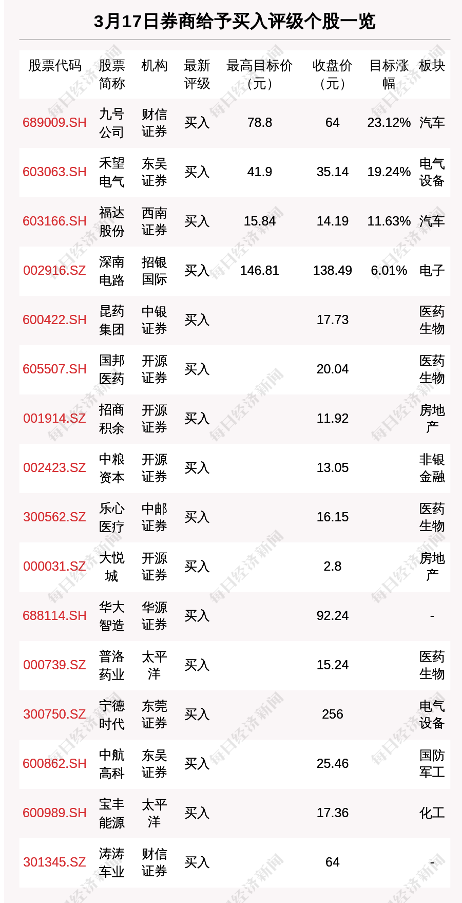 每经AI快讯,3月17日,券商给予评级的个股数共有33只,获得买入评级的个股数共有16只。在公布了目标价格的4只个股中,按照最新收盘价计算,预期涨幅排名居前的个股是九号公司(689009.SH)、禾望电气(603063.SH)、福达股份(603166.SH),预期涨幅分别是23.12%、19.24%、11.63%。