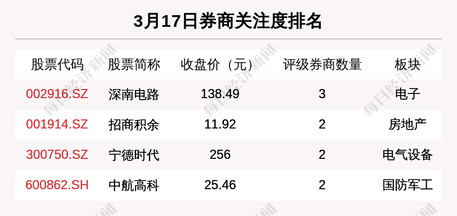 从券商对个股的关注程度来看,有4只个股获得多家券商关注,券商关注数量排名居前的个股是深南电路(002916.SZ)、招商积余(001914.SZ)、宁德时代(300750.SZ)。