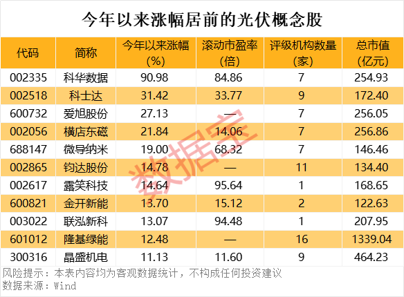 据证券时报·数据宝统计,截至3月17日,光伏概念股今年以来平均涨幅3.12%。科华数据、科士达、爱旭股份和横店东磁4股累计涨幅均超过20%,分别为90.98%、31.42%、27.13%、21.84%。