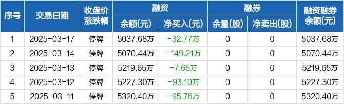 融资方面,当日融资买入0元,融资偿还32.77万元,融资净偿还32.77万元,连续6日净偿还累计485.71万元。融券方面,融券卖出0股,融券偿还0股,融券余量0股,融券余额0元。融资融券余额合计5037.68万元。