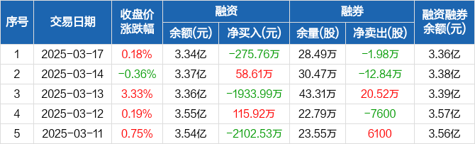 融资方面,当日融资买入1989.77万元,融资偿还2265.53万元,融资净偿还275.76万元。融券方面,融券卖出400股,融券偿还2.02万股,融券余量28.49万股,融券余额158.69万元。融资融券余额合计3.36亿元。