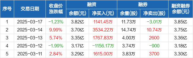 融资方面,当日融资买入1.4亿元,融资偿还1.28亿元,融资净买入1141.45万元,连续3日净买入累计6443.5万元。融券方面,融券卖出1.05万股,融券偿还4.06万股,融券余量11.73万股,融券余额377.71万元。融资融券余额合计3.85亿元。