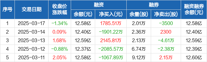 融资方面,当日融资买入7779.09万元,融资偿还5993.58万元,融资净买入1785.51万元。融券方面,融券卖出2200股,融券偿还5700股,融券余量2.01万股,融券余额45.71万元。融资融券余额合计12.58亿元。