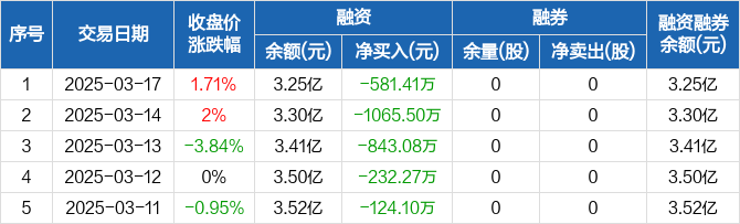 融资方面,当日融资买入659.59万元,融资偿还1241万元,融资净偿还581.41万元,连续5日净偿还累计2846.36万元。融券方面,融券卖出0股,融券偿还0股,融券余量0股,融券余额0元。融资融券余额合计3.25亿元。
