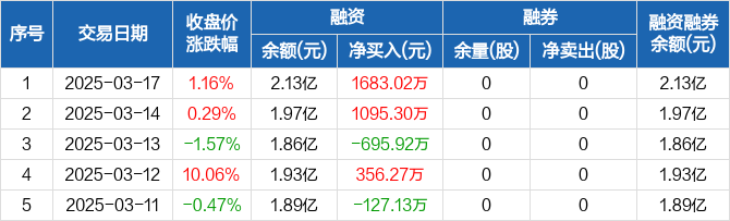 融资方面,当日融资买入4663.85万元,融资偿还2980.83万元,融资净买入1683.02万元。融券方面,融券卖出0股,融券偿还0股,融券余量0股,融券余额0元。融资融券余额合计2.13亿元。
