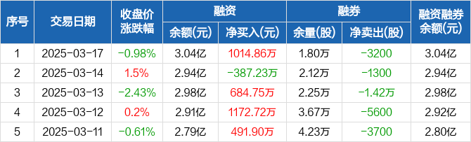融资方面,当日融资买入1949.11万元,融资偿还934.25万元,融资净买入1014.86万元。融券方面,融券卖出0股,融券偿还3200股,融券余量1.8万股,融券余额43.56万元。融资融券余额合计3.04亿元。