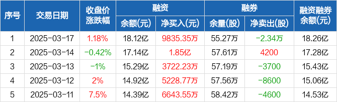 融资方面,当日融资买入5.69亿元,融资偿还4.7亿元,融资净买入9835.35万元,连续7日净买入累计5.83亿元。融券方面,融券卖出7300股,融券偿还3.07万股,融券余量55.27万股,融券余额1322.61万元。融资融券余额合计18.26亿元。