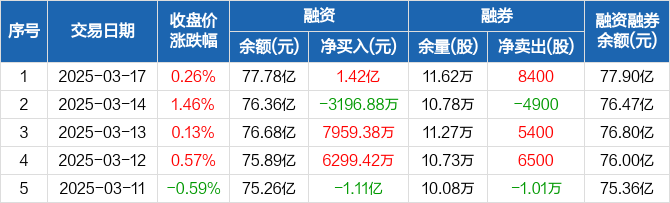 中际旭创融资融券信息显示,2025年3月17日融资净买入1.42亿元;融资余额77.78亿元,创历史新高,较前一日增加1.85%。