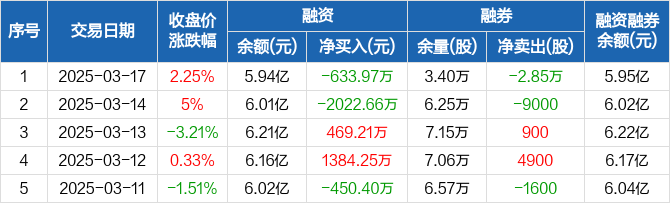 融资方面,当日融资买入5878.38万元,融资偿还6512.34万元,融资净偿还633.97万元。融券方面,融券卖出0股,融券偿还2.85万股,融券余量3.4万股,融券余额64.94万元。融资融券余额合计5.95亿元。