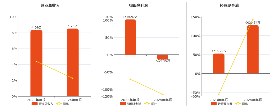 公司营业总收入为4.75亿元。归母净利润为-197.40万元,较去年同报告期归母净利润减少1544.36万元,同比较去年同期下降114.65%。经营活动现金净流入为9020.54万元。