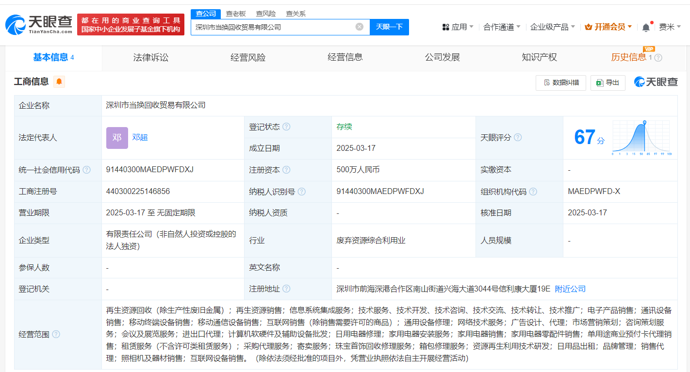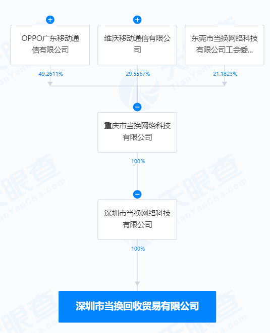 每经AI快讯,天眼查App显示,近日,深圳市当换回收贸易有限公司成立,法定代表人为邓超,注册资本500万元人民币,经营范围包括再生资源回收、再生资源销售、信息系统集成服务、电子产品销售、通用设备修理、网络技术服务等。股权全景穿透图显示,该公司由深圳市当换网络科技有限公司全资持股,后者为重庆市当换网络科技有限公司全资子公司。值得一提的是,重庆市当换网络科技有限公司由OPPO广东移动通信有限公司、维沃移动通信有限公司、东莞市当换网络科技有限公司工会委员会共同持股。