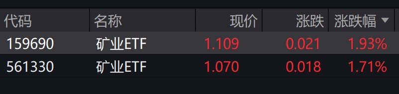 受盘面影响,跟踪中证有色金属矿业主题指数的矿业ETF涨近2%。