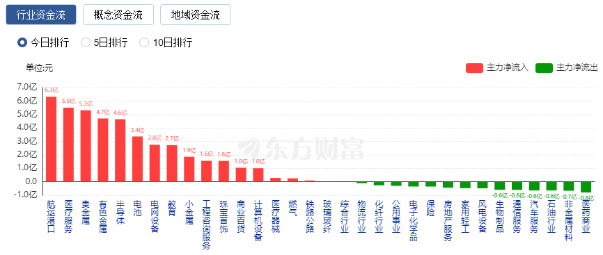 行业资金方面,截至午间收盘,航运港口、医疗服务等净流入排名靠前,其中航运港口净流入6.3亿元。