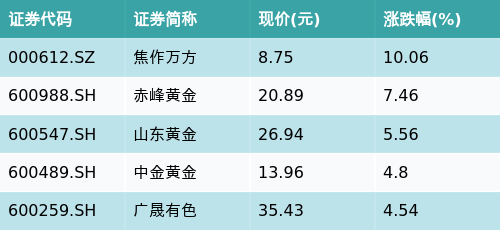 截至早盘收盘,稀缺资源主题涨跌幅最高的五只股票为:焦作万方(000612.SZ)、赤峰黄金(600988.SH)、山东黄金(600547.SH)、中金黄金(600489.SH)与广晟有色(600259.SH)。详情见下表: