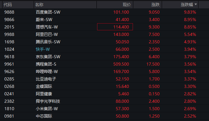 具体个股方面,百度一度涨超10%,目前涨幅仍有9%以上,蔚来、理想汽车涨超8%,阿里巴巴涨超5%。