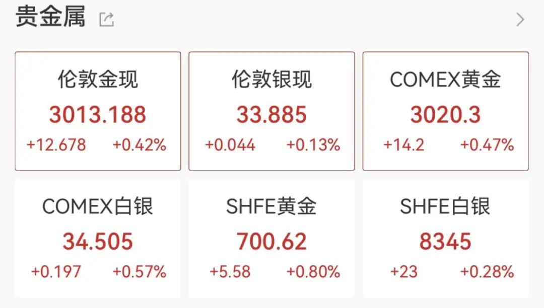 消息面上,中东局势再度升温,国际金价继续走高。现货黄金站上3020美元/盎司,伦敦金现盘中涨超3013美元/盎司,均创历史新高。