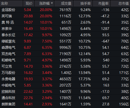 充电桩概念股表现活跃,金冠股份、英可瑞20CM涨停,奥特迅、京泉华、泰永长征等纷纷涨停。