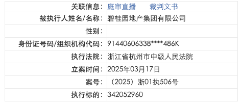 中国执行信息公开网显示,3月17日,碧桂园地产集团有限公司新增2条被执行人信息,执行标的合计4.43亿余元,被执行人还包括浙江碧桂园管理咨询有限公司、青岛悦发置业有限公司,执行法院为浙江省杭州市中级人民法院、山东省青岛市中级人民法院。