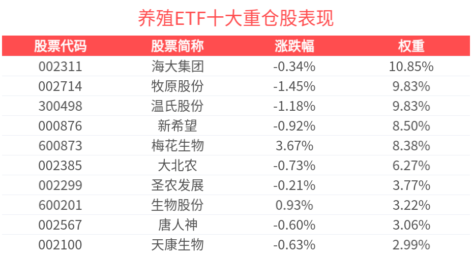 数据显示,截至2025年2月28日,中证畜牧养殖指数(930707)前十大权重股分别为海大集团(002311)、温氏股份(300498)、牧原股份(002714)、新希望(000876)、梅花生物(600873)、大北农(002385)、圣农发展(002299)、生物股份(600201)、唐人神(002567)、天康生物(002100),前十大权重股合计占比69.16%。