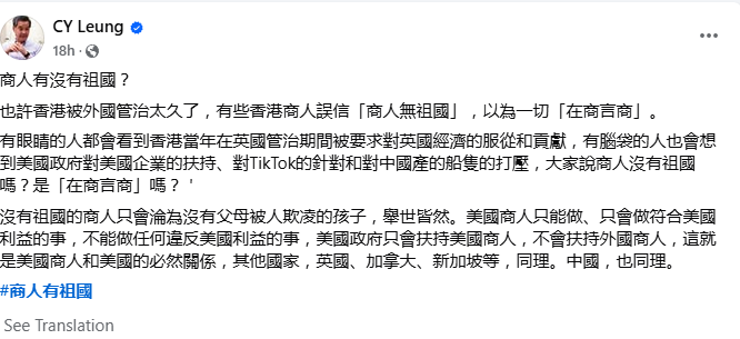 有眼睛的人都会看到香港当年在英国管治期间被要求对英国经济的服从和贡献,有脑袋的人也会想到美国政府对美国企业的扶持、对TikTok的针对和对中国产的船只的打压,大家说商人没有祖国吗?是“在商言商”吗?