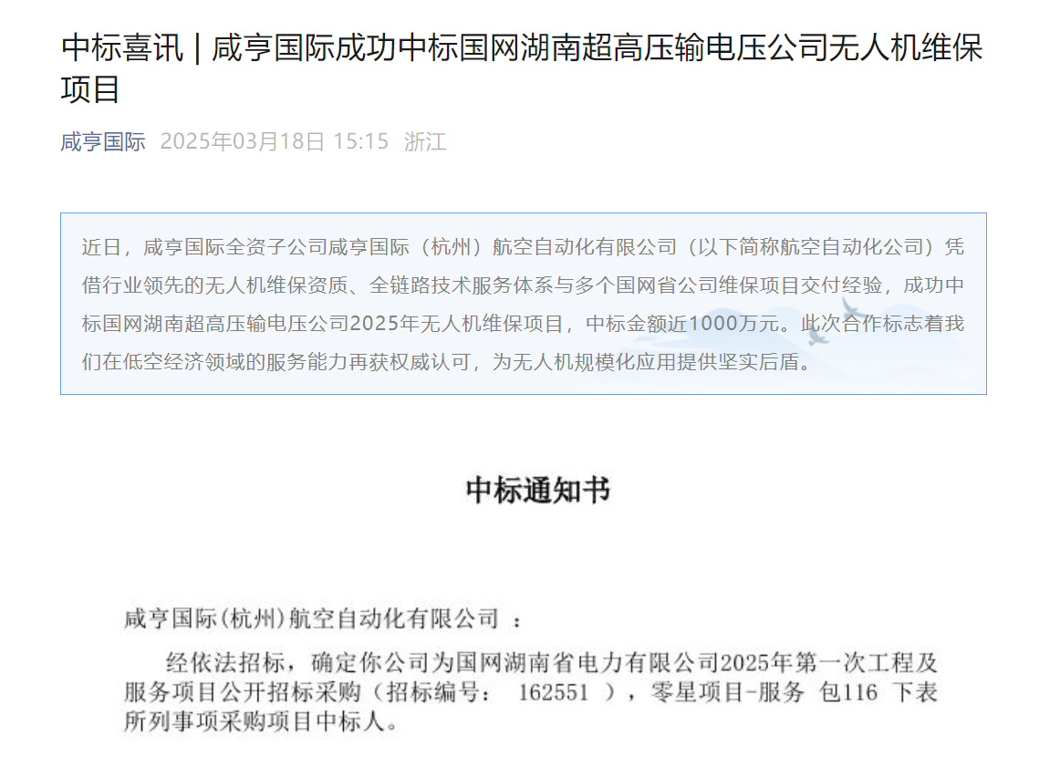 每经AI快讯,近日,咸亨国际全资子公司咸亨国际(杭州)航空自动化有限公司(以下简称航空自动化公司)凭借行业领先的无人机维保资质、全链路技术服务体系与多个国网省公司维保项目交付经验,中标国网湖南超高压输电压公司2025年无人机维保项目,中标金额近1000万元。此次合作标志着公司在低空经济领域的服务能力再获权威认可,为无人机规模化应用提供坚实后盾。