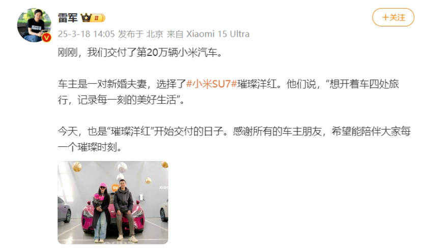 3月18日,小米集团董事长雷军在微博发文称,小米汽车累计交付量达20万辆,交付车型为璀璨洋红色小米SU7。雷军表示,“今天也是‘璀璨洋红’开始交付的日子”。