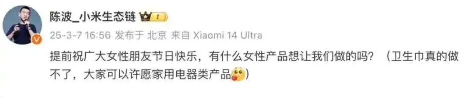 关于小米是否会生产卫生巾等产品,此前3月7日,小米生态链总经理陈波发文:“提前祝广大女性朋友节日快乐,有什么女性产品想让我们做的吗?(卫生巾真的做不了,大家可以许愿家用电器类产品)”