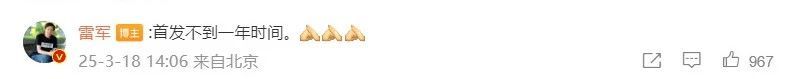 同时,雷军还在评论区留言“首发不到一年”。据悉,小米SU7是小米集团造车后发布的首款车型,于2024年3月28日正式上市。