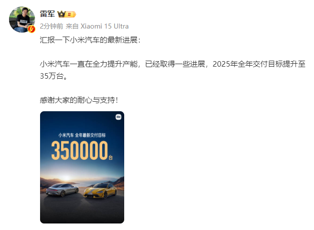 【大河财立方消息】3月18日,小米CEO雷军表示,小米汽车正在全力提升产能,并已取得一定进展,将2025年全年的交付目标提升至35万台。