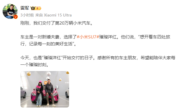 此外,雷军还提到,已交付第20万辆小米汽车。