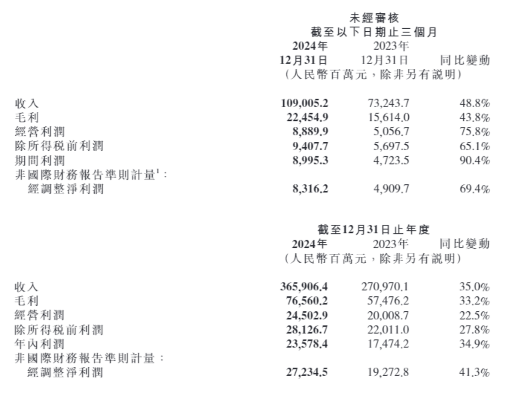 据公告,2024年第四季度,集团总收入首次单季度突破1000亿元,达到1090亿元,创历史新高,同比增长48.8%。2024年第四季度,集团经调整净利润为83亿元,创历史新高,同比增长69.4%。其中包括智能电动汽车等创新业务经调整净亏损7亿元。