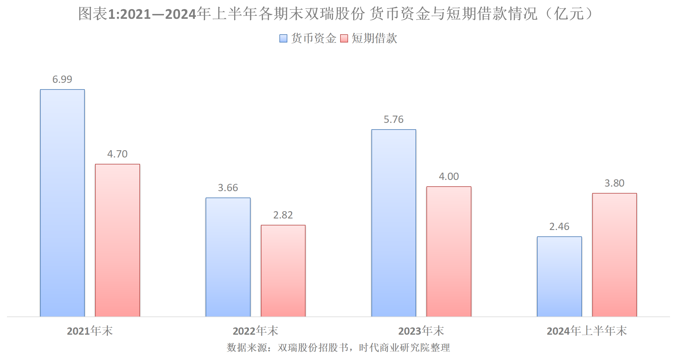 报告期各期末,双瑞股份的短期借款分别为4.70亿元、2.82亿元、4.00亿元、3.80亿元。由此可见,2021—2023年末,双瑞股份的货币资金均能覆盖短期借款,但是2024年上半年,由于货币资金骤减近六成,已经难以覆盖短期借款。
