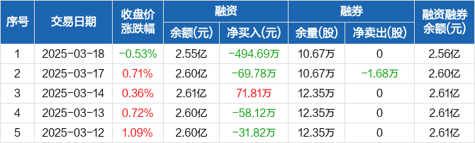 融资方面,当日融资买入338.99万元,融资偿还833.69万元,融资净偿还494.69万元。融券方面,融券卖出0股,融券偿还0股,融券余量10.67万股,融券余额60.07万元。融资融券余额合计2.56亿元。