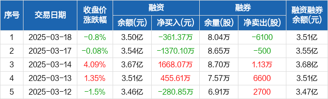 融资方面,当日融资买入822.42万元,融资偿还1183.79万元,融资净偿还361.37万元。融券方面,融券卖出0股,融券偿还6100股,融券余量8.04万股,融券余额99.29万元。融资融券余额合计3.51亿元。