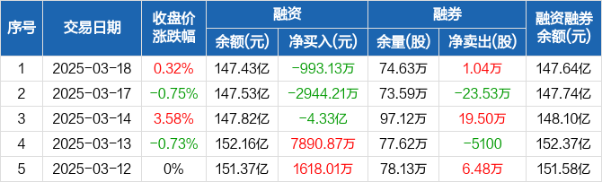 融资方面,当日融资买入2.2亿元,融资偿还2.3亿元,融资净偿还993.13万元,连续3日净偿还累计4.72亿元。融券方面,融券卖出4.63万股,融券偿还3.59万股,融券余量74.63万股,融券余额2085.91万元。融资融券余额合计147.64亿元。