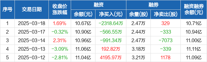 融资方面,当日融资买入5094.95万元,融资偿还7413.59万元,融资净偿还2318.64万元,连续3日净偿还累计3876.54万元。融券方面,融券卖出529股,融券偿还200股,融券余量2.47万股,融券余额409.87万元。融资融券余额合计10.71亿元。