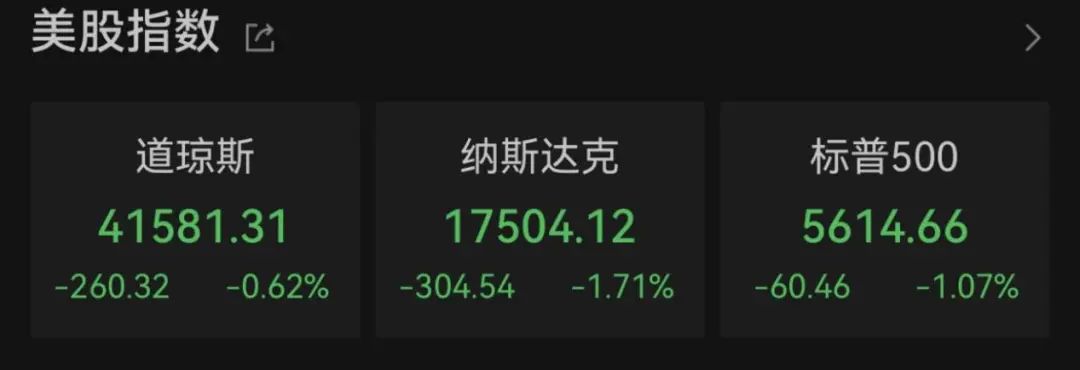 道指跌260.32点,跌幅为0.62%,报41581.31点;纳指跌304.55点,跌幅为1.71%,报17504.12点;标普500指数跌60.46点,跌幅为1.07%,报5614.66点。