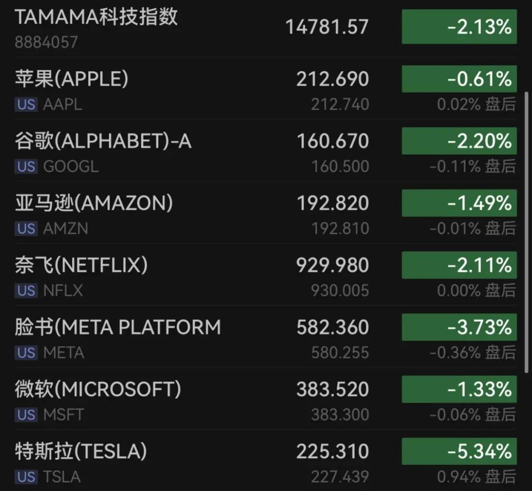 大型科技股全线下跌,特斯拉跌超5%,脸书跌逾3%,英伟达跌超3%,谷歌跌逾2%,亚马逊跌超1%,微软跌逾1%,苹果跌0.61%。