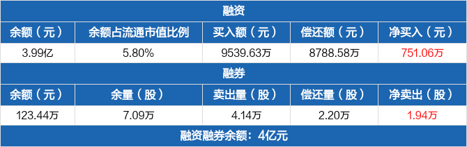 融资方面,当日融资买入9539.63万元,融资偿还8788.58万元,融资净买入751.06万元,连续6日净买入累计4227.58万元。融券方面,融券卖出4.14万股,融券偿还2.2万股,融券余量7.09万股,融券余额123.44万元。融资融券余额合计4亿元。