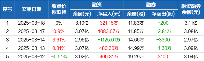 融资方面,当日融资买入3111.33万元,融资偿还2790.18万元,融资净买入321.15万元。融券方面,融券卖出300股,融券偿还500股,融券余量11.83万股,融券余额119.96万元。融资融券余额合计3.11亿元。