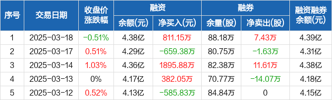 融资方面,当日融资买入1980.95万元,融资偿还1169.8万元,融资净买入811.15万元。融券方面,融券卖出7.43万股,融券偿还0股,融券余量88.18万股,融券余额173.71万元。融资融券余额合计4.39亿元。