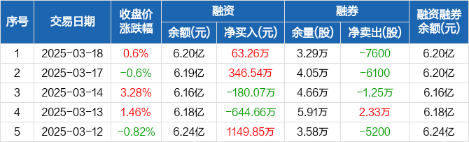 融资方面,当日融资买入1677.5万元,融资偿还1614.24万元,融资净买入63.26万元。融券方面,融券卖出0股,融券偿还7600股,融券余量3.29万股,融券余额16.58万元。融资融券余额合计6.2亿元。