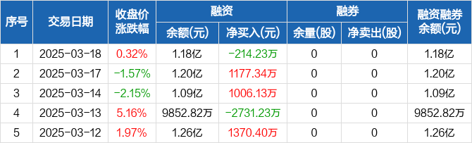 融资方面,当日融资买入878.6万元,融资偿还1092.83万元,融资净偿还214.23万元。融券方面,融券卖出0股,融券偿还0股,融券余量0股,融券余额0元。融资融券余额合计1.18亿元。