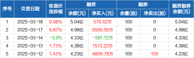 融资方面,当日融资买入2.39亿元,融资偿还2.33亿元,融资净买入576.62万元。融券方面,融券卖出0股,融券偿还0股,融券余量100股,融券余额1796元。融资融券余额合计5.04亿元。