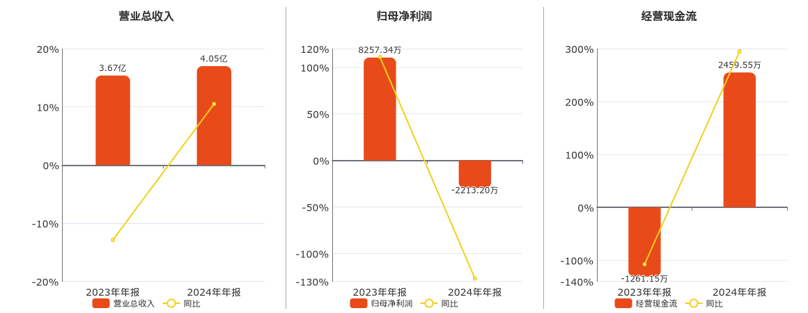 公司营业总收入为4.05亿元。归母净利润为-2213.20万元,较去年同报告期归母净利润减少1.05亿元,同比较去年同期下降126.80%。经营活动现金净流入为2459.55万元。