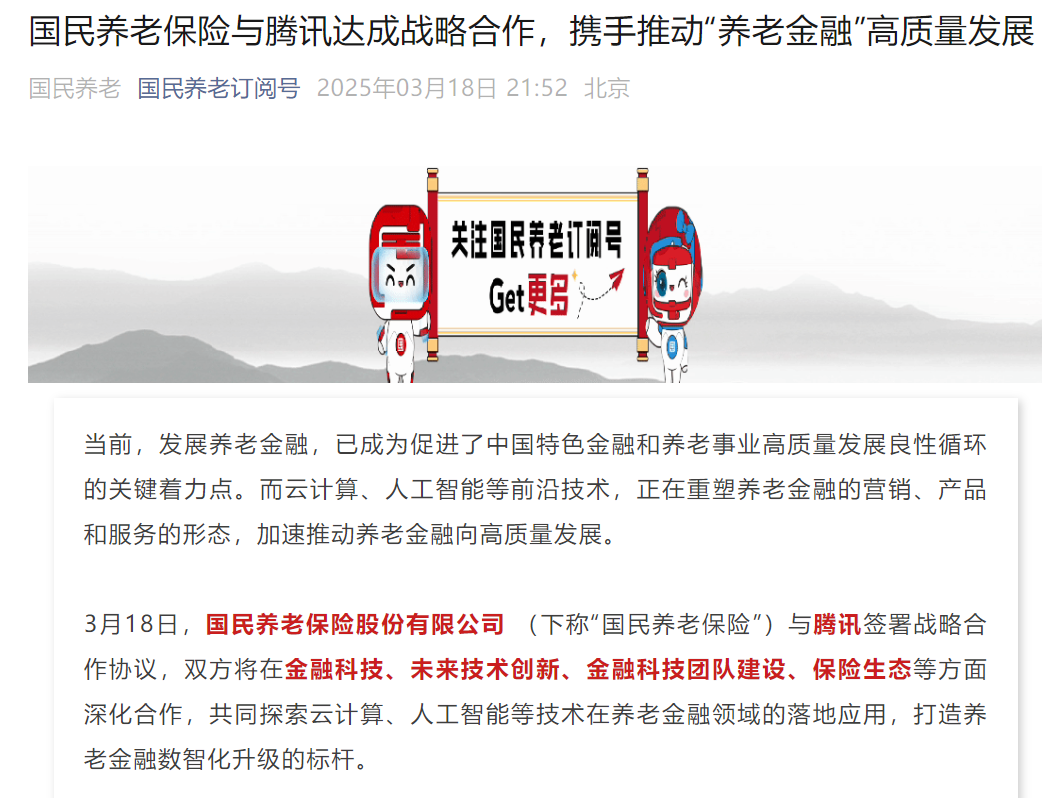 每经AI快讯,3月18日,国民养老保险股份有限公司 (下称“国民养老保险”)与腾讯签署战略合作协议,双方将在金融科技、未来技术创新、金融科技团队建设、保险生态等方面深化合作,共同探索云计算、人工智能等技术在养老金融领域的落地应用,打造养老金融数智化升级的标杆。
