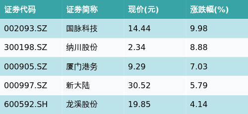 截至早盘收盘,福建主题涨跌幅最高的五只股票为:国脉科技(002093.SZ)、纳川股份(300198.SZ)、厦门港务(000905.SZ)、新大陆(000997.SZ)与龙溪股份(600592.SH)。详情见下表: