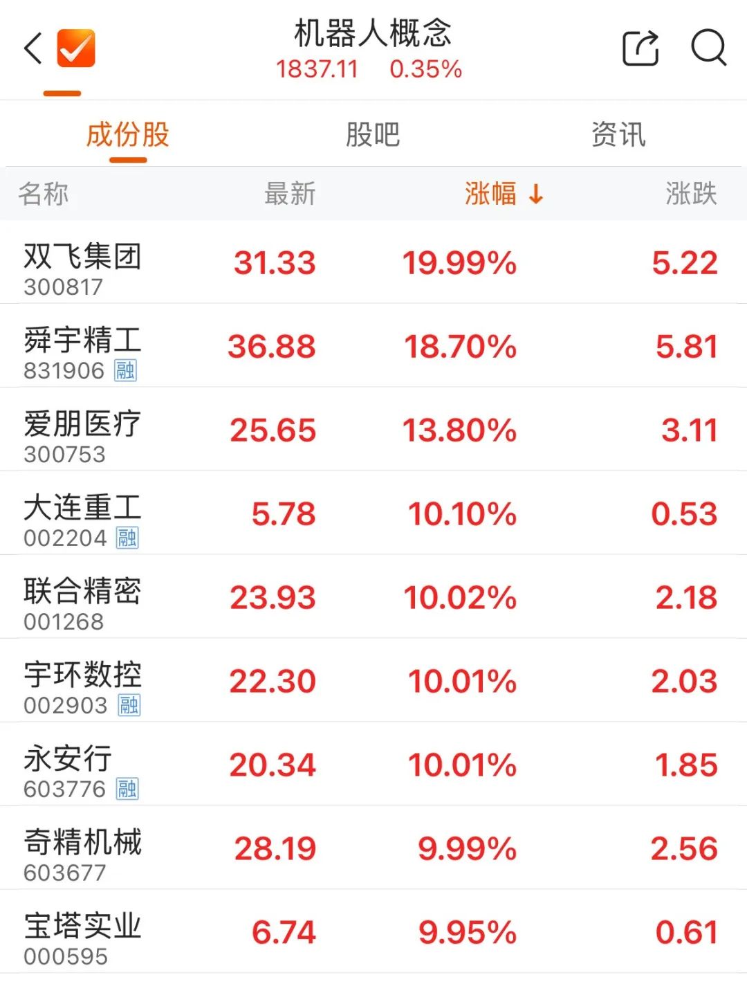 3月19日,机器人概念股局部活跃,截至发稿,双飞集团20%涨停,宇环数控2连板,联合精密直线涨停,东土科技、方正电机等跟涨。