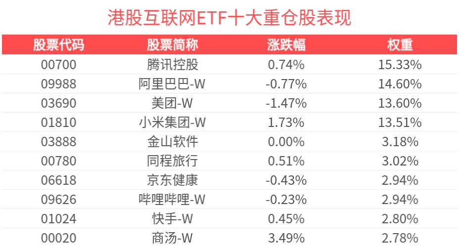 数据显示,截至2025年2月28日,中证港股通互联网指数(931637)前十大权重股分别为阿里巴巴-W(09988)、小米集团-W(01810)、腾讯控股(00700)、美团-W(03690)、金蝶国际(00268)、阿里健康(00241)、金山软件(03888)、京东健康(06618)、快手-W(01024)、哔哩哔哩-W(09626),前十大权重股合计占比78.75%。